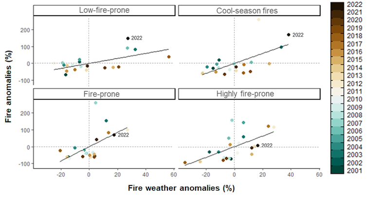 نعتقد أن هذه الخصوصية – الحرائق التي تحدث في الغالب في مناطق كانت تاريخياً محصنة نسبياً – تساعد في تفسير تصوير وسائل الإعلام لعام 2022.