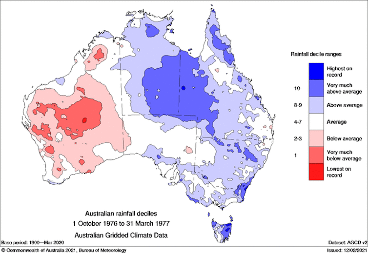 خلال 1976-1977 ، نشأت ظاهرة النينيو الضعيفة جنبًا إلى جنب مع ثنائي القطب في المحيط الهندي المحايد. جاء ذلك بعد غطسة ثلاثية في ظاهرة النينيا مشابهة لتلك التي مررنا بها للتو. بعد تطور ظاهرة النينيو ، كان هطول الأمطار في فصلي الربيع والصيف أعلى من المتوسط في الكثير من شرق أستراليا.