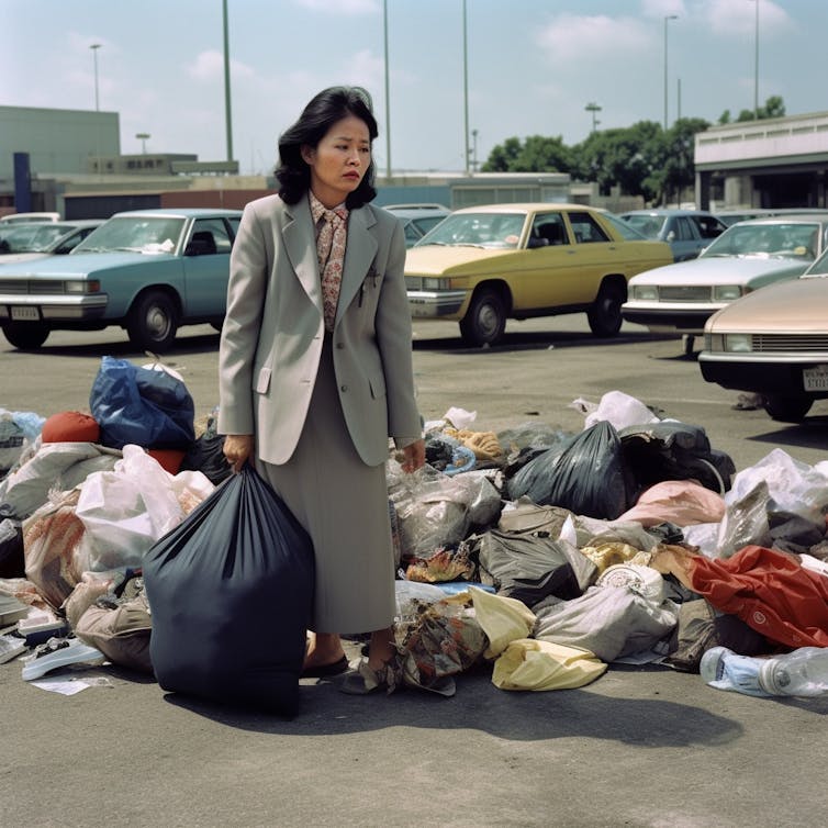 To conjure photographs in MidJourney, I collected information to engineer a range of prompts. I noted details of my mother’s departure from Thailand – her age, the location, her clothing and the trimester of her pregnancy. I also included my own interpretation of how she would have felt as a 30-year-old woman travelling alone to white Australia in the 1970s. She spoke little English and had no family or friends of her own to begin life with my father, who she barely knew.
