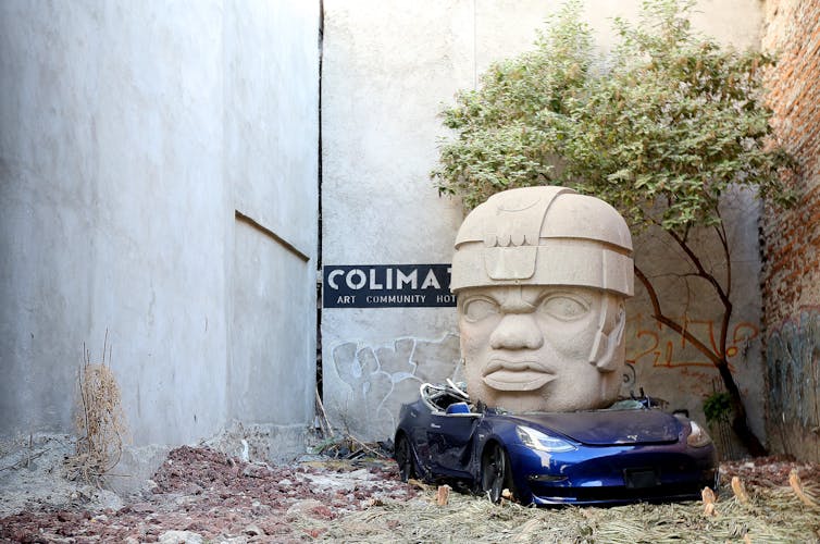 Earlier this year in Mexico City, artist Chavis Marmol dropped a nine-tonne replica of the colossal head carvings of the Olmec, the first known Mesoamerican civilisation, onto a blue Tesla 3. The Olmec head landed a year after Tesla announced plans to build a huge factory in northern Mexico.