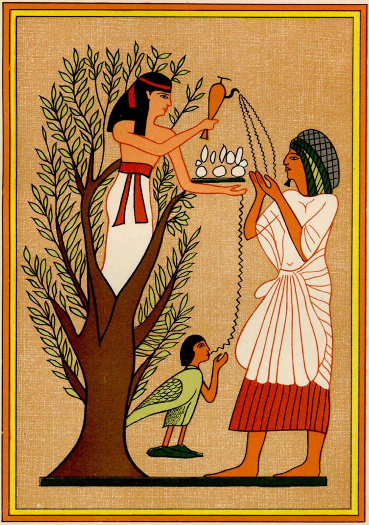 The Bas of the dead were free to leave and return to the netherworld as they wished. Nut is often shown standing in a sycamore tree and providing food and water to the deceased and their Ba.