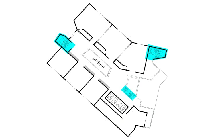 تشير الأبحاث إلى أن بناء السلالم في زوايا المبنى وفصلها عن الردهة يمكن أن يقلل الضوضاء. بهذه الطريقة لن تقاطع الحركة العمودية أي مساحات تعلم مركزية.