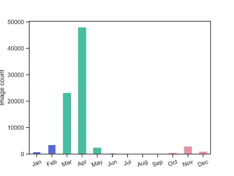 بعد ذلك ، قمنا تلقائيًا بتصفية الصور التي تظهر على أنها تحتوي على محتوى حددته خوارزميات الرؤية الحاسوبية التي لم تتطابق مع أزهار الكرز المستهدفة. على سبيل المثال ، احتوى العديد منها على صور لأوراق الخريف ، وهو حدث بيئي شائع آخر يمكن مشاهدته في اليابان.