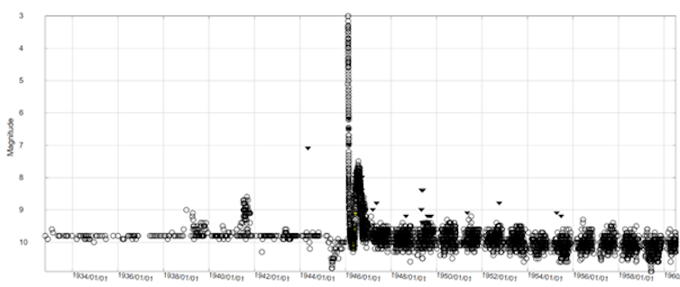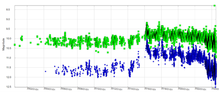 The star’s two most recent eruptions – in 1866 and 1946 – showed the exact same features. About ten years prior to the eruption, T CrB’s brightness increased a little (known as a high state) followed by a short fading or dip about a year out from the explosion.