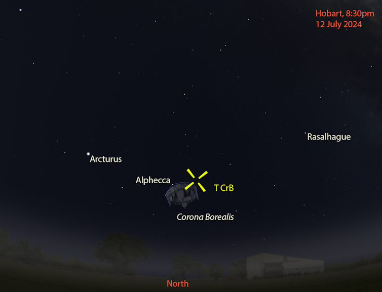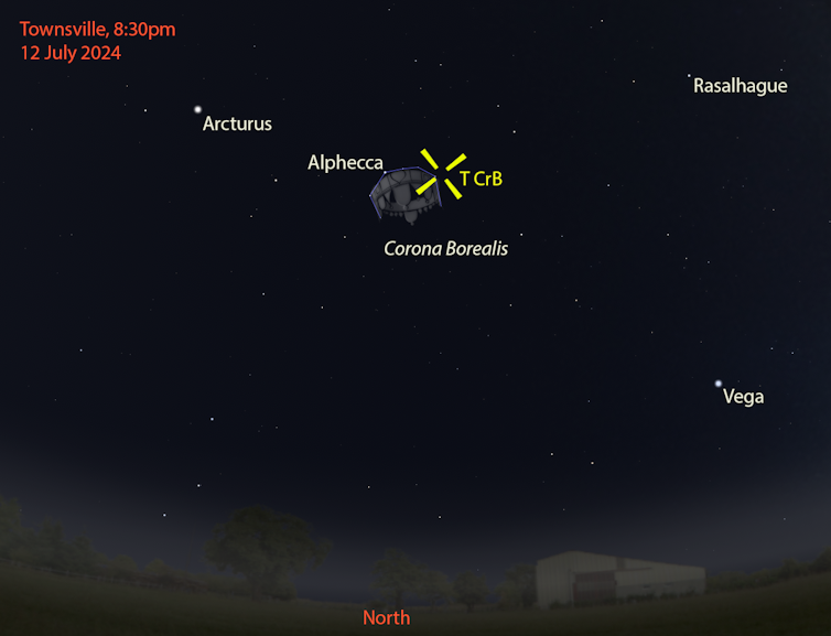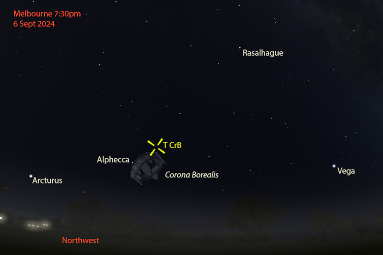 The star in question is T Coronae Borealis (T CrB, pronounced “T Cor Bor”). It lies in the constellation of the northern crown, prominent in the Northern Hemisphere but also visible in the northern sky from Australia and Aotearoa New Zealand over the next few months.