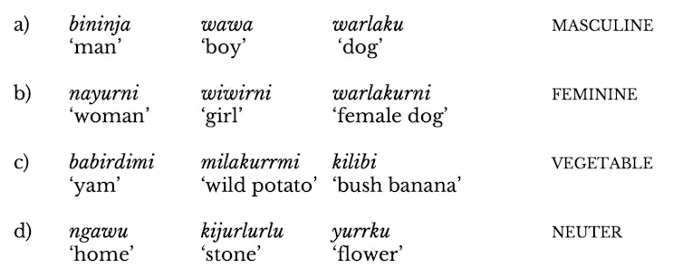 For other First Nations languages, there is a spiritual dimension to gender classification. The northern Queensland language Dyirbal also has four genders.