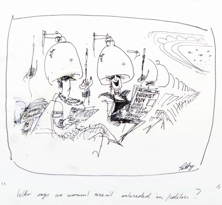 Something similar happens with the privileged women under the hairdryers in the cartoon, Who says we women aren’t interested in politics?