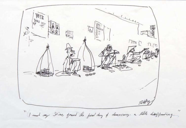 His career as a political cartoonist started with a trip to London in the late 1950s, then a stint at young Rupert Murdoch’s afternoon paper in Sydney, the Mirror.