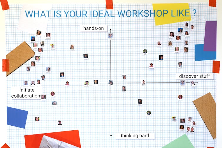 على سبيل المثال ، في إعداد “كرة الثلج” ، يشرح كل مشارك ابتكاره أو ابتكارها لمشارك آخر ، والذي يقوم بتدوين الملاحظات على ورقة مخصصة. ثم يتعاون كل ثنائي مع زوج آخر لتبادل وتلخيص مناقشتهم. ثم يتعاونون مع زوجين آخرين ، وهكذا دواليك. في نهاية الورشة ، يتم عرض الأوراق في شكل معرض صغير ، يمكن للجميع مشاهدته كما يحلو لهم. باختصار ، لقد سمع الجميع عن ابتكارات بعضهم البعض ، وتعمل الأوراق كمواد خام لورش العمل المستقبلية. لقد اختبرنا أيضًا جلسات المسرح والتمثيل الصامت والعصف الذهني التي تنتهي بفيديو محتمل ، وما إلى ذلك.