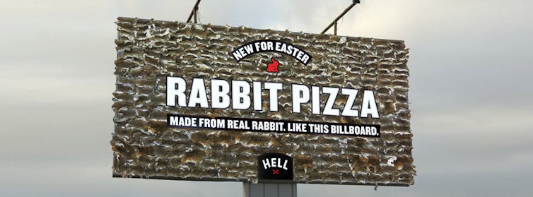 Hell Pizza’s 2014 Easter-themed billboard covered in rabbit skin (promoting its “rabbit pizza”) also received complaints for being disrespectful to religious groups and vegans.
