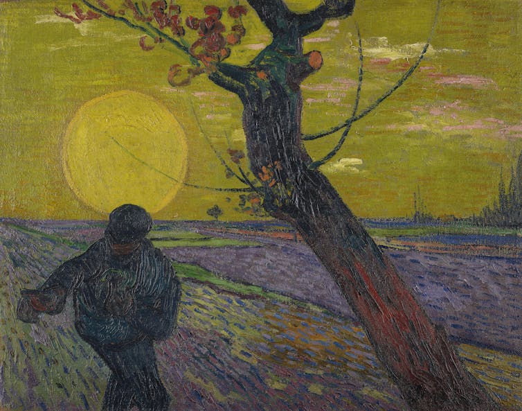 Van Gogh’s starting point was always nature, but he drew endlessly on his own imagination. Instead of describing reality, he transformed his figures and their settings through repetition and the subjective use of colour and line, signalling a modern symbolist approach to painting. Rather than produce a naturalistic and individualised representation of a man sowing seeds, for example, he created a universal type that suggested continuity, regrowth and the cycle of the seasons.