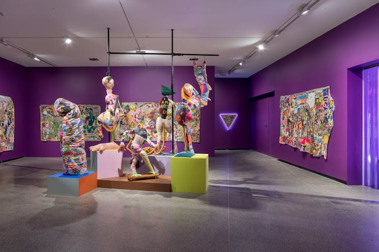 تسكن التماثيل الناعمة لأجسام بشرية / كرتونية هجينة جنسيًا في المعرض على نطاق مواجه ومثير للاهتمام في نفس الوقت.